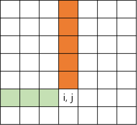 arr[][]와 주황색과[i][j]까지의 거리가 같다면, 주황색에서[i][j]로 이동할 수 있다는 것을 알게 된다. 따라서,dp[i][j] += dp[k][j];를 해주면, 주황색 부분까지 가는 경우의 수를 더해준다는 의미가 되겠다.for (int k = 1; k < i; k++) { if (arr[k][j] == i - k) { dp[i][j] += dp[k][j]; } } - 초록색 부분을 검사하는 코드가 다음과 같다. 초록색 부분을 돌면서, 주황색 부분에 든 숫자